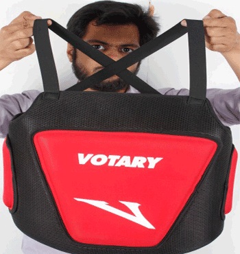 Los protecciones de estómago de Votary están fabricados a base de un acolchado de gel de tres capas de 7,5 cm. de espesor junto con una capa externa de espuma de baja densidad de 12 mm. El protector tiene con una capa interior de avanzada tecnología para expulsar la humedad y un sistema doble de correas con velcro para mejorar el ajuste.• Acolchado multi capa de gel de 7,5 cm. de grueso de alta densidad par la absorción de impactos.